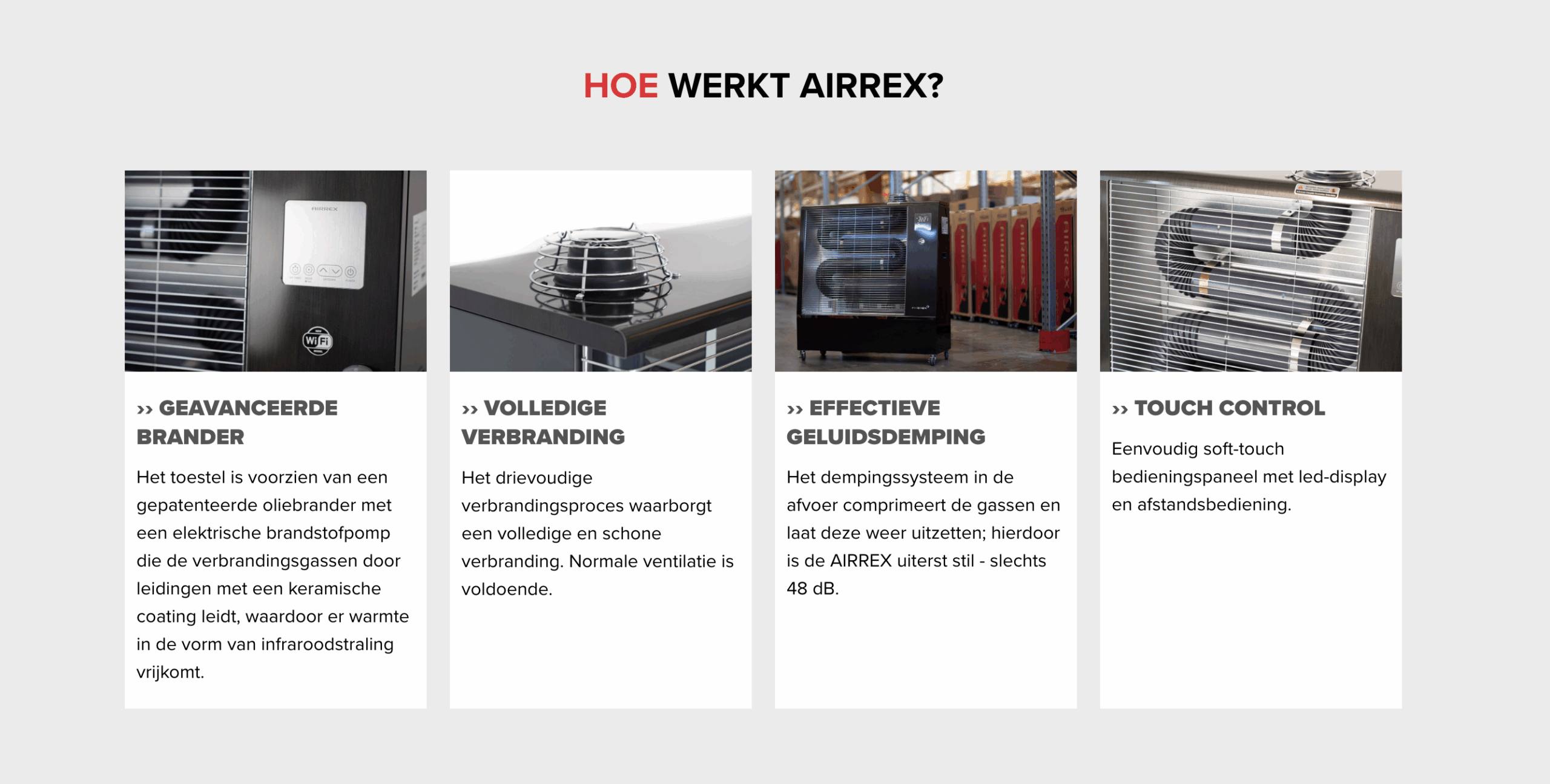 100% energiezuinigheid; Airrex-kachels zijn de enige kachels op de markt die alle energie gebruiken, waardoor ze tot 30% efficiënter zijn dan hun concurrenten. Airrex infraroodstralers verwarmen het materiaal, niet alleen de lucht. Daarom blijft de warmte aanwezig in de ruimte en verdwijnt niet wanneer bijvoorbeeld de deur wordt geopend.