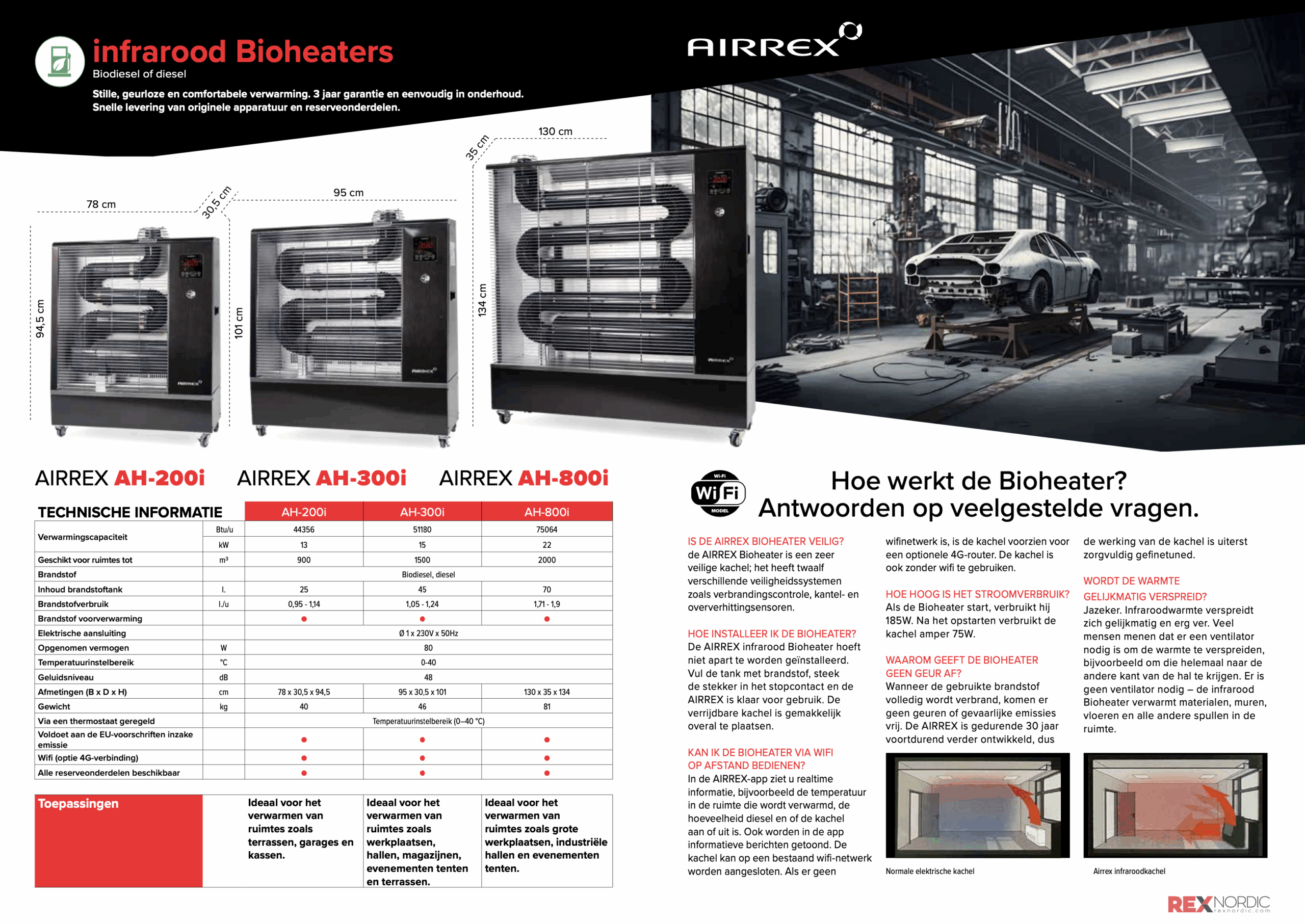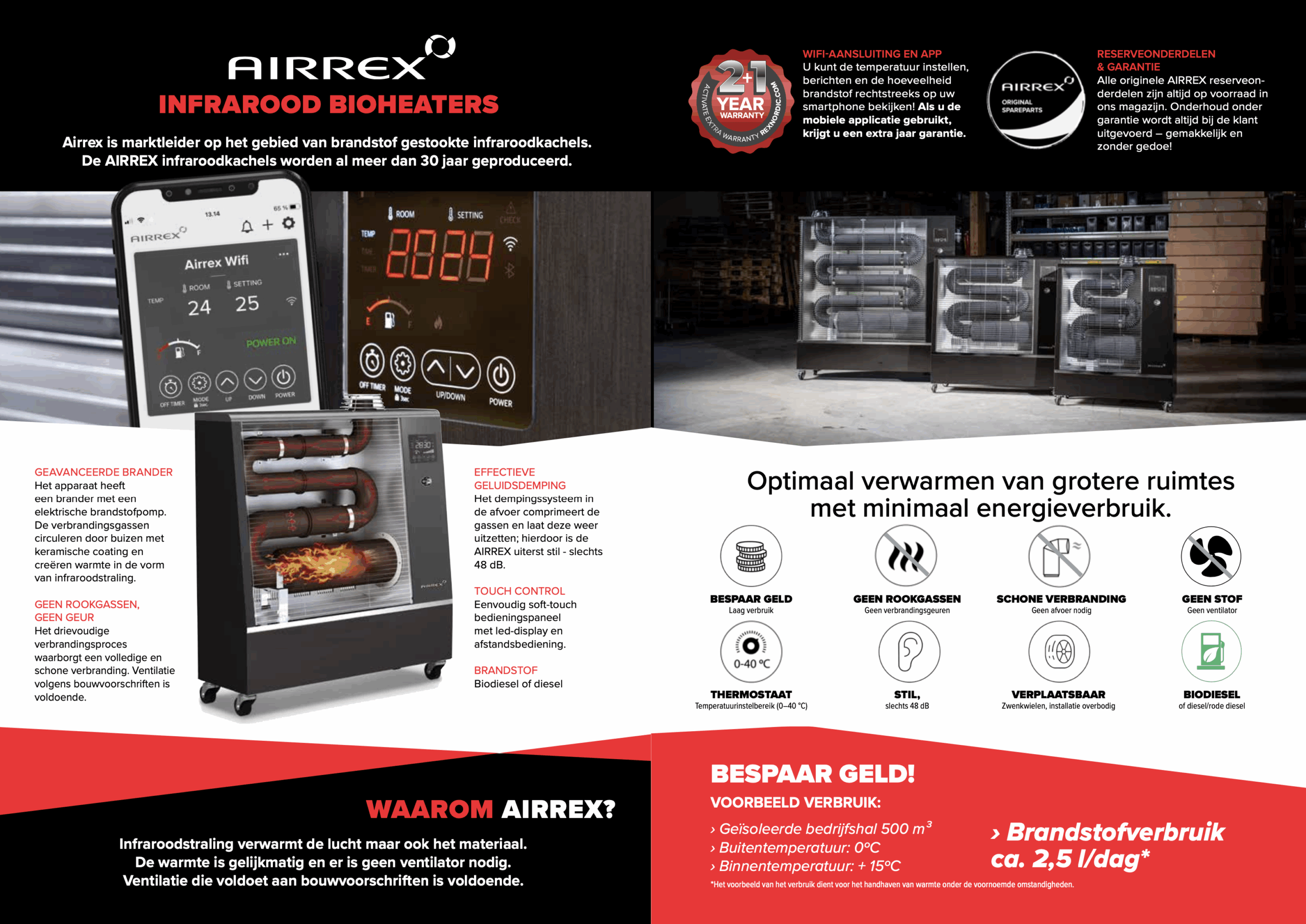 Uiterst rendabele infraroodstraler zonder rook en geur. 100% energiezuinigheid; Airrex-kachels zijn de enige kachels op de markt die alle energie gebruiken, waardoor ze tot 30% efficiënter zijn dan hun concurrenten. Airrex infraroodstralers verwarmen het materiaal, niet alleen de lucht. Daarom blijft de warmte aanwezig in de ruimte en verdwijnt niet wanneer bijvoorbeeld de deur wordt geopend. Airrex-kachels voldoen aan alle EU-emissie-eisen.
