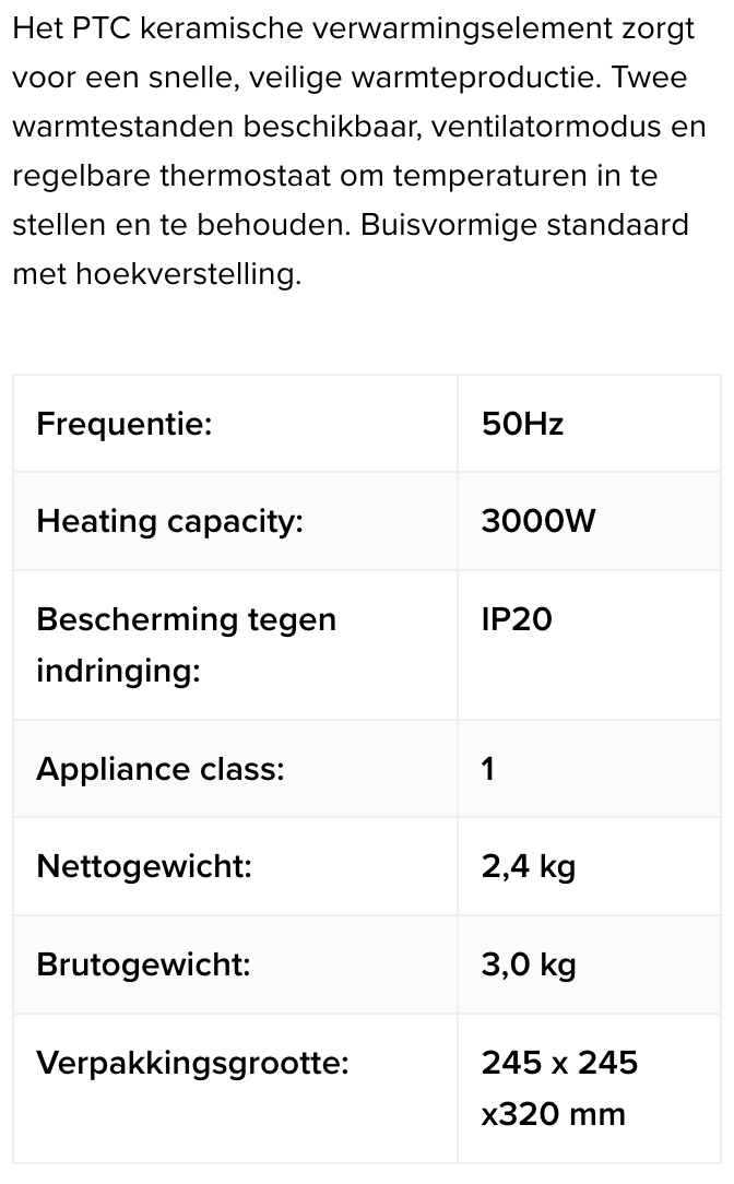 Twee warmtestanden beschikbaar, ventilatormodus en regelbare thermostaat om temperaturen in te stellen en te handhaven. Buisvormige standaard met hoekverstelling.