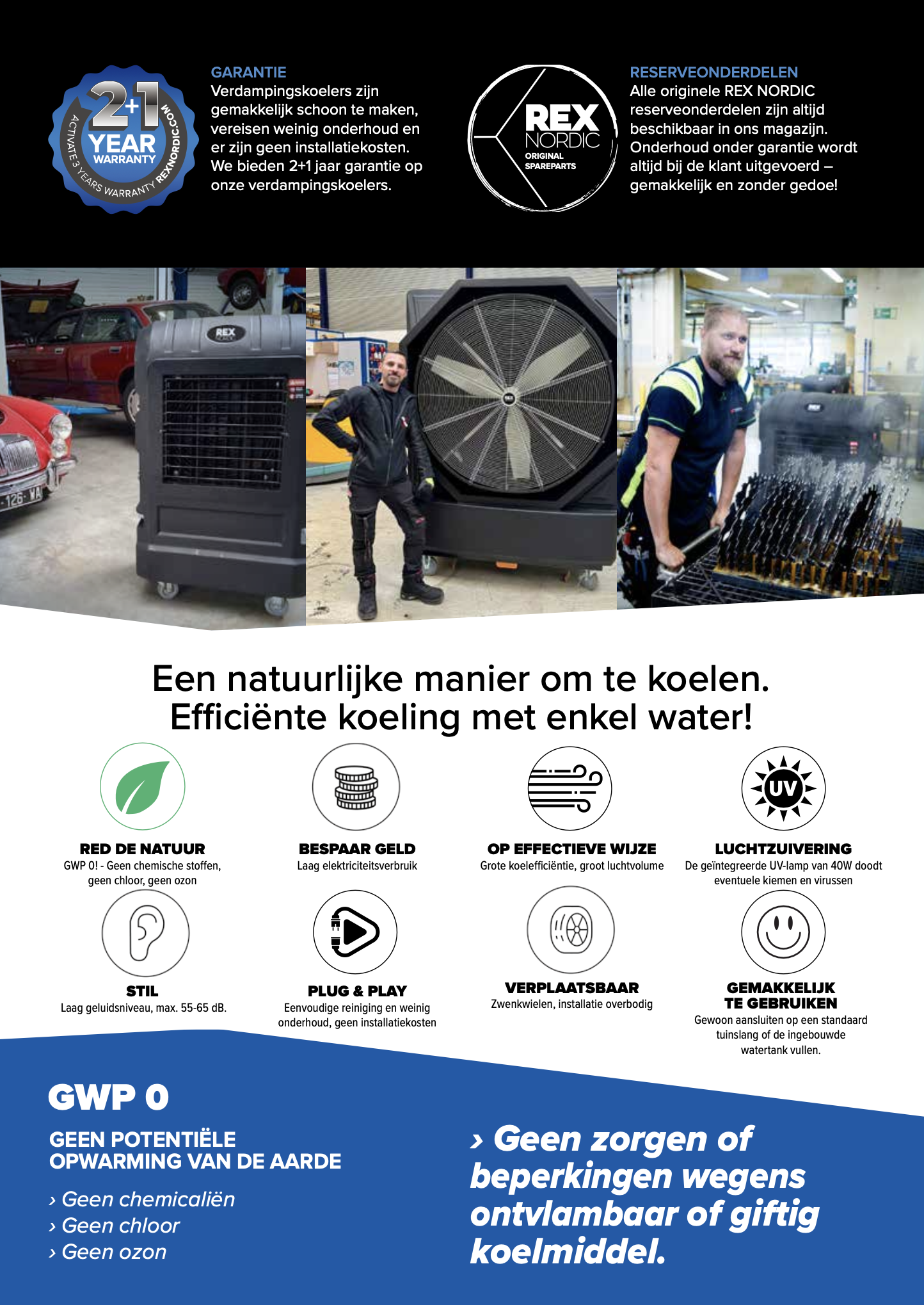 Een effectief ingebouwd uv C-licht doodt mogelijke ziektekiemen en virussen. REX14000 heeft een laag energieverbruik, slechts een fractie van een airconditioning. Het is een energiebesparende koeloplossing met een hoog luchtvolume – zonder waternevel.